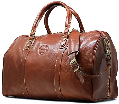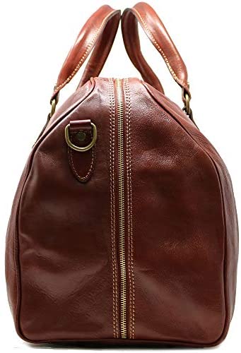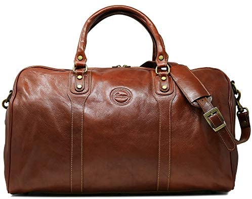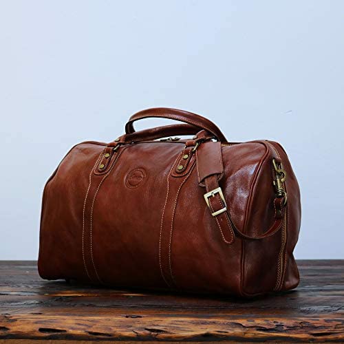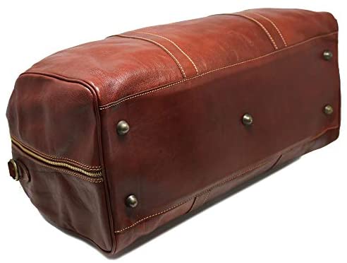 The Cenzo Duffle Bag is the perfect 1-3 night weekender. It is made in Italy using Italian calfskin leather, brass zipper, smart contrast stitching, durable 8 oz cotton duck canvas lining, and brass hardware. The vegetable tanned leather looks better as it ages. One characteristic of our vegetable leather is that it has large pores and absorbs smell – so you might detect a sweet nail polish scent when you remove it from the plastic for the first time. Please take note of this characteristic. This new leather smell is the result of the leather edge paint and clear stain coating – it fades after 24 hours in fresh air. Weight is 4.5 pounds