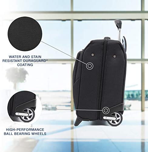 Lightweight, rolling carry on garment bag with lay flat design keeps dresses, suits and other clothes wrinkle free during travel. Polyester fabric with stain resistant, water repellant duraguard coating and ergonomic, high tensile strength zipper pulls provide lasting durability