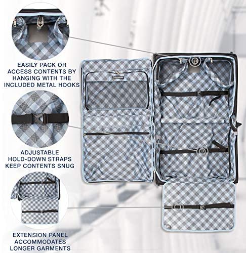 Lay flat design with padded straps keeps dresses, suits and other clothes wrinkle free during travel. Front flap, roomy interior and built in pockets keep contents organized and accessible
